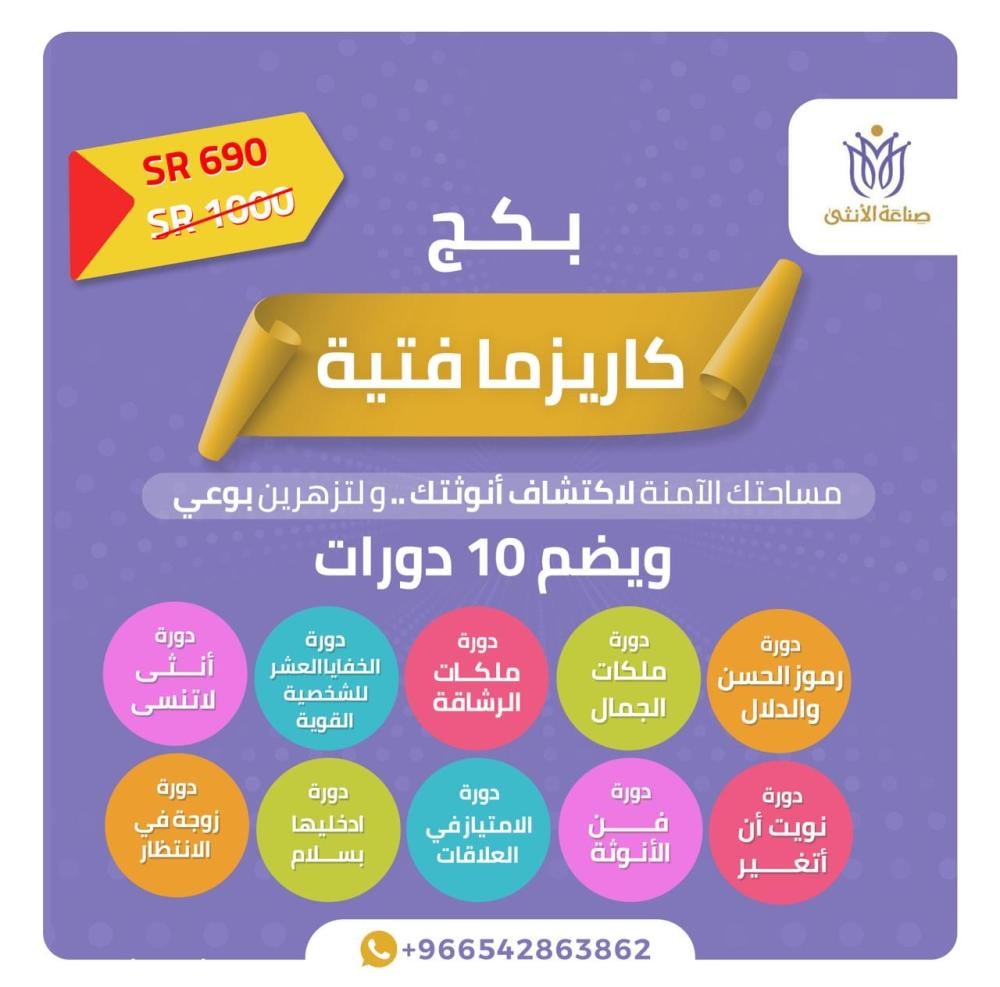 ستحتاجين إلى دورة: الخفايا العشر للشخصية القوية, ودورة أنثى لا تُنسى , ودورة نويتُ أن أتغيّر , ودورة الامتياز في العلاقات الاجتماعية